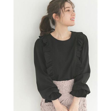 フロントにあしらわれたフリルが目を惹くブラウス。袖口をキュッと絞ってフレアにしたキャンディースリーブが、フェミニンさを引き上げます。カジュアルなデニムパンツにもレディなスカートにも合わせやすく、様々なスタイリングが楽しめるアイテムです。