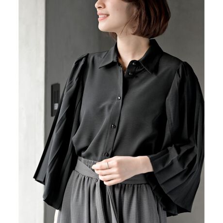 プリーツをあしらったフレアスリーブが魅力のブラウス。
