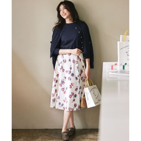 ■デザインペイントタッチのチューリッププリントの中にハートモチーフが隠れている遊び心のあるプリント。張りのある素材を生かした綺麗なシルエットのボリュームタックフレアスカート。幅広のウエスト切り替え下に配色のパイピングテープで全体を引き締めています。ウエスト後ろにゴムを入れて程よいフィット感と着心地の良さと、さらに両サイドにポケットを付けオシャレと機能性も兼ね備えたスカートです。