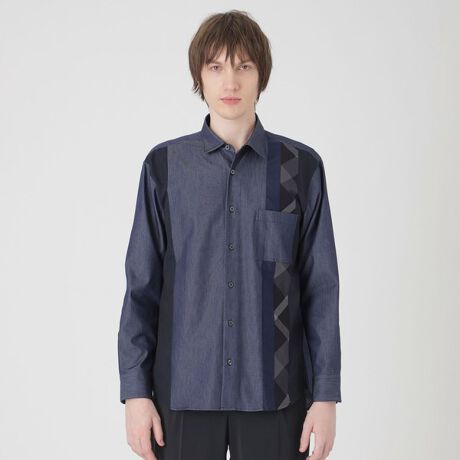 【フロントをチェック柄で切り替えたパッチワークデザインのデニム調シャツ】
