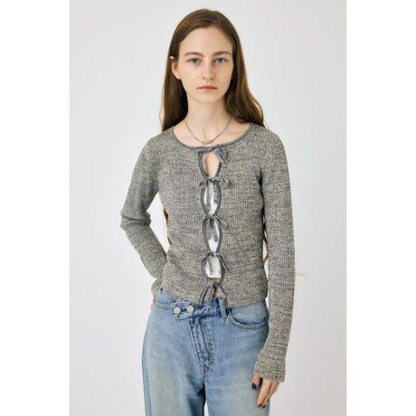 【FRONT RIBBON KNIT TOP / フロントリボン ニットトップス】■ポイントキラキラなニットと、フロントのリボンがポイントのカーデトップス。■ディテール1枚で安心感のあるリブニットにラメ糸を編み込み、着るだけで華やかな印象に。フロントのリボンが目を引くポイントに。■スタイリングリボンをすべて結んでトップスとして。リボンを垂らしてカーディガンとしても着て頂けるアイテムです。合わせるボトムは選ばずに、1枚で華やかな印象になるアイテムです。※本品はラメ糸を使用したニット製品になります。取り扱い表示の確認をお願いいたします。■生地透け感:無裏 地:無伸縮性:有光沢感:有■商品のお気に入り登録お気に入りアイテムの再入荷・在庫1点などの通知を受け取ることができます。■ブランドのお気に入り登録新作アイテムの入荷や人気アイテムの再入荷、おすすめトピックスなど、いち早くブランドの情報を受け取ることができます。[注意事項]※弊社管理上のカラーを表記しており、タグのカラー表記と異なる記載となっている場合がございます。※商品画像の色味は、屋外や屋内の光の照射や角度により実物と色味が異なる場合がございます。※着用、お取り扱いの際は、アテンションタグをご確認ください。