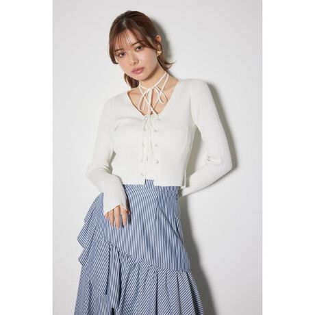 【アウターインにもおすすめなチョーカーリボンニットで旬バランスが叶うニットトップ】■ポイント今季トレンドのチョーカーデザインと、レースアップを取り入れた、ニットプルオーバー。首元にくるっと紐を巻いてコーディネートをモードな印象に。リボンは首の後ろで結んでも、前で結んでもOK。ニットのレースアップから繋がっているので、もつれること無くすっきりとご着用いただけます。ソフトで肌触りもよく程よいフィット感のハイゲージニット生地で着心地も抜群です。■ディテールまるでレイヤードしているかのフロントデザインもポイント。紐は長めにデザインしているので様々なリボンアレンジをお楽しみいただけます。■スタイリングどんなアウターの中にもINできるタイトニット。ショート丈なので、様々なボトムとの相性も抜群です。■生地透け感:なし裏 地:なし伸縮性:あり光沢感:なし厚さ:中肉■商品のお気に入り登録お気に入りアイテムの再入荷・在庫1点などの通知を受け取ることができます。[注意事項]※画像の商品はサンプルです。実際の商品と仕様、加工が若干異なる場合があります。※画像の商品は光の照射や角度、お使いのモニター環境により、実物と色味が異なる場合がございます。※着用、お取り扱いの際は、アテンションタグをご確認ください。