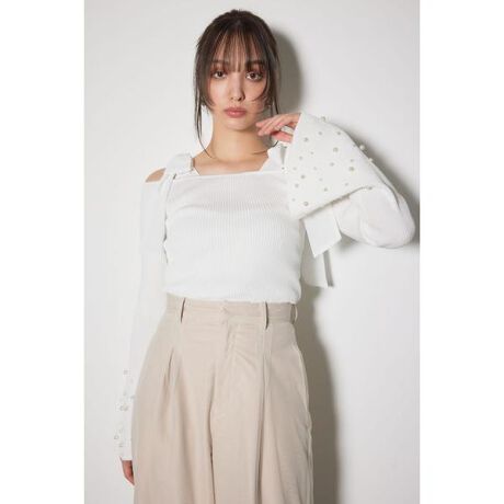 【シフォンのリボンがフェミニンなムードを引き立てる】■ポイントボディーラインをキレイに見せてくれるニットに、肩にはやわらかなシフォンのリボン、袖口にたっぷりパールをあしらったデコラティブな1枚に仕上がりました。■ディテール目を惹くショルダーリボンは調節が可能。リボンを後ろ側に持ってきてもバックコンシャスに着ていただけます。オフショルダーには程よいテンションのゴムが入っているのでずり落ちる心配もありません。ラッパ袖にすることで手元に抜け感を出し、あしらわれたパールがよりニュアンス感を演出します。■スタイリングミニにもロングスカートにも合わせやすいトップスになっています。デニムに合わせてキレイ目カジュアルも◎■生地透け感:なし裏地:なし伸縮性:あり光沢感:なし厚さ:中肉■商品のお気に入り登録お気に入りアイテムの再入荷・在庫1点などの通知を受け取ることができます。[注意事項]※画像の商品はサンプルです。実際の商品と仕様、加工が若干異なる場合があります。※画像の商品は光の照射や角度、お使いのモニター環境により、実物と色味が異なる場合がございます。※着用、お取り扱いの際は、アテンションタグをご確認ください。