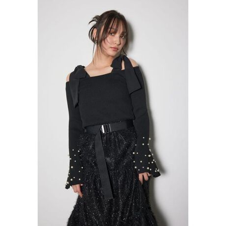 【シフォンのリボンがフェミニンなムードを引き立てる】■ポイントボディーラインをキレイに見せてくれるニットに、肩にはやわらかなシフォンのリボン、袖口にたっぷりパールをあしらったデコラティブな1枚に仕上がりました。■ディテール目を惹くショルダーリボンは調節が可能。リボンを後ろ側に持ってきてもバックコンシャスに着ていただけます。オフショルダーには程よいテンションのゴムが入っているのでずり落ちる心配もありません。ラッパ袖にすることで手元に抜け感を出し、あしらわれたパールがよりニュアンス感を演出します。■スタイリングミニにもロングスカートにも合わせやすいトップスになっています。デニムに合わせてキレイ目カジュアルも◎■生地透け感:なし裏地:なし伸縮性:あり光沢感:なし厚さ:中肉■商品のお気に入り登録お気に入りアイテムの再入荷・在庫1点などの通知を受け取ることができます。[注意事項]※画像の商品はサンプルです。実際の商品と仕様、加工が若干異なる場合があります。※画像の商品は光の照射や角度、お使いのモニター環境により、実物と色味が異なる場合がございます。※着用、お取り扱いの際は、アテンションタグをご確認ください。