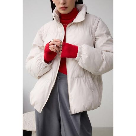 ■2WAY中綿スタンドコート■ポイント袖取り外しができる2WAY仕様の中綿コート。シンプルなスタンドデザインで程よいサイズ感の軽いアウターになります。■ディティール2WAY仕様のベストで着た時にもきれいに見えるようなディティールになっています。小顔効果にもなるようスタンドネックにしています。■スタイリングシンプルな中綿のコートになるのでどんなアイテムにも合わせやすいです。程よいサイズ感でルーズすぎない形なので中綿でもスタイルアップ出来るようなサイズ感にしています。スカートスタイルにもパンツスタイルにも合わせやすいアウターになります。■生地光沢感のあるポリエステルタフタを使用しています。透け感:なし裏 地:あり伸縮性:なし光沢感:あり