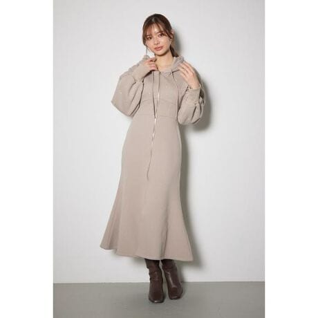 【程良い抜け感で美しいスタイルが叶うスウェットマーメイドワンピ】【Design】トレンドライクなジップデザインとフーディで、今年らしさを兼ね備えたスウェットマーメイドワンピ。膝下からなだらかに広がるマーメイドラインやギャザーを寄せて程よくふんわりと仕上げた上身頃など、女性らしいシルエットにデザインしました。上身頃には小さ目なビジューを散りばめて、カジュアル見えし過ぎないのもポイント。更に着用時に着痩せするように美シルエットにも拘りました。1枚でさらっと着られる気軽さはワンマイルウェアにもぴったりです。■透け感:無し■光沢感:無し■伸縮性:あり■裏地:無し