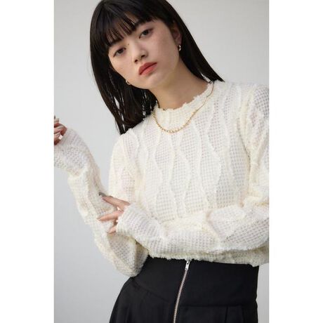 ■ジャガードカットソートップス■ポイントやや詰まったネック、袖もやや長めにし、トップスやインナー両面でお使い頂けるデザイン。透け感のある素材でも表面感と女性らしさのある柄がポイントです。■ディティール素材の表面はフリンジで曲線の柄を出しています。表情があり、1枚でも様になる上品な印象のトップスに仕上げています。■スタイリングインナーにはキャミソールなどを合わせていただくのがおすすめです。アウターのインナーにも合わせやすい1枚です。■生地透け感のある編地に毛足の短いフリンジを刺繍のようにたたいて柄を作っています。過度に負荷が掛かったり、洗濯の繰り返しで柄がほつれてくる可能性がありますが、生地特性によるものです。透け感:あり裏 地:なし伸縮性:生地特性上あり光沢感:刺しゅう(柄)部分はあり