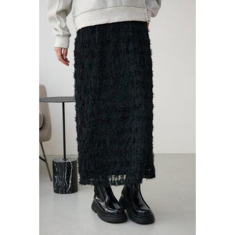 ■カットレーススカート■ポイント毛足のあるフリンジのようなレース使いのカットソースカートです。穿きやすさと素材に存在感のある両面を持ち合わせたスカートです。■ディティールシルエットはナロー型でスッキリとしており、女性らしさがあります。レースの表面感も特徴的で1テクある商品です。■スタイリングボリュームのあるトップスやアウターと好相性です。■生地フリンジのように表面に特徴があるレースを使用しています。透け感:あり裏 地:あり伸縮性:ややあり光沢感:ややあり