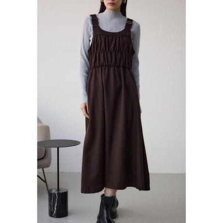 ■シャーリング2WAYジャンパースカート■ポイント前後2WAYで着れる合成皮革素材のジャンパースカート。シンプルなZIPデザインとシャーリングの入ったデザインの2タイプが楽しめる仕様になっています。■ディティールシャーリングデザインの方は胸元にシャーリングを入れることでウエストラインがきれいに見えるようにしています。片方にはベルトデザインを入れているのでシンプルなハイゲージのニットにも映えるようなディティールに仕上げています。逆にするとZIPのデザインでクールなディティールに仕上げています。■スタイリング2WAYで表情が変わるので女性らしくもクールなスタイルにも使える1枚となっています。1年通して使用できる素材になっているので冬はハイゲージニットとの相性が良く春夏にはTシャツとの相性も良く1枚持っているだけで様々なスタイルに出来る1枚となります。■生地M.BLKには柔らかな合成皮革を使用しています。BRNは膨らみのあるポリエステルツイル素材を使用しています。透け感:なし裏 地:あり伸縮性:合成皮革ややあり光沢感:合成皮革あり