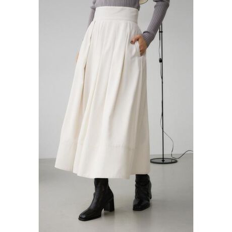 ■ボックスプリーツスカート■ポイント微起毛のかかった温かみのある素材を使用した、今季トレンドのボックスプリーツデザインのフレアスカートになります。■ディティールフレアのシルエットにこだわり、裾に太い切り替えを入れることで着用したときに綺麗なフレアシルエットが出るようなディティールになっています。ウエストは後ろだけゴム仕様にして着脱がしやすくなっています。■スタイリングコンパクト目なトップスにボリュームの出るフレアシルエットの相性が良くおすすめのスタイリングになります。ウォーム感のある生地を使用しているのでスウェットやカジュアルな素材との相性も良いです。今季はショート丈のアウターとのスタイリングもおすすめです。■生地微起毛ツイルを使用。透け感:なし裏 地:O/WHTのみあり伸縮性:なし光沢感:なし