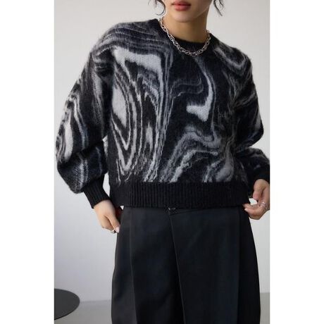 ■マーブルクロップドジャガードニット■ポイントAZULオリジナルのマーブル柄のシャギーニット。■ディティール抽象的なマーブル柄が目う惹くシャギーニット。定番のモノトーン柄に加え、春らしいブルーとライトベージュの3色展開です。コンパクトな着丈なのでシャギー素材でもスタイルアップが叶います。■スタイリングフレアデニムとのコーディネートがおすすめです。■生地やわらかなケバ感のあるニット素材。起毛加工を施しています。透け感:なし裏 地:なし伸縮性:あり光沢感:なし