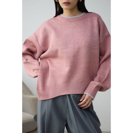 ■スウェットライクジャガードニット■ポイント鮮やかな春カラーが目を惹くスウェットライクなニット。■ディティールスウェットのようなシンプルなデザインながら、ニットならではの素材感、鮮やかな春カラーと程よいラメ感で普段のコーディネートをワンランクアップしてくれる一枚。衿と袖口のラメラインもポイントです。さりげないコクーンシルエットで気になる腰回りをカバー、スタイルアップも叶います。■スタイリングデニム合わせでカジュアルにも、タイトスカート合わせでフェミニンなスタイルもにも◎。■生地さらりとしたアクリル糸にラメ糸を織り交ぜたニット。Wジャガードで編み上げることで、適度に厚みを出してスウェットライクに仕上げています。透け感:なし裏 地:なし伸縮性:あり光沢感:あり