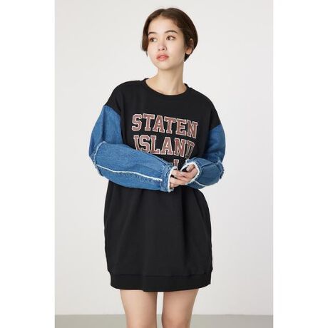 ■デザイン:大人気のデニムドッキングアイテムが登場。スウェットワンピースとデニムジャケットをドッキングしたようなデザインのワンピース。カラーによって異なるカレッジデザインがポイント。■おすすめスタイリング:一枚でワンピースとしてはもちろん、ボトムやスカートを合わせて、ルーズなトップスとして着用するのもおすすめ。■ポケット:なし■裏地:なし■透け感:なし■伸縮性:あり※クラックプリントのひび割れは、製品毎に個体差が生じます。経年劣化によりプリントが剥がれることがございます。デニム部分は経年劣化により色落ちします。予めご了承ください。