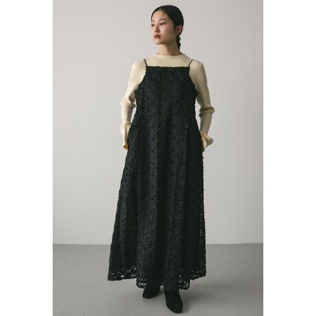 モデル身長165cm(Mサイズ着用)チュールにテープ刺繍を施した素材で仕立てた華やかなキャミワンピース。ボリュームが出ないように工夫したシルエットとデティールが大人な印象に導きます。異素材サテン素材の華奢なストラップは調整可能。ポケット付き。透け感裏地付き、ストレッチなし。【お手入れ方法】手洗い可