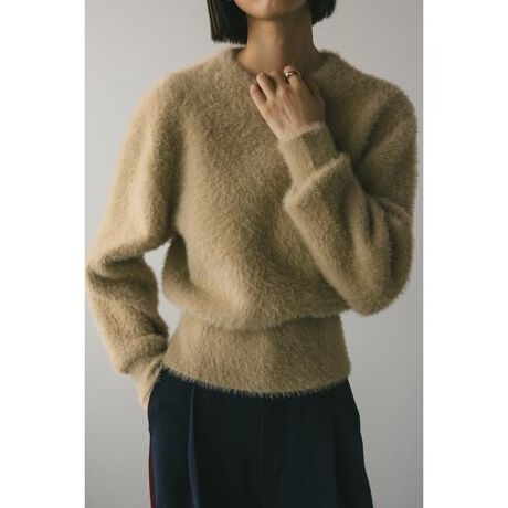 モデル身長166cm(FREEサイズ着用)上品見えにこだわったミニシャギーで編み立てたフォルムニット。コンパクトな丈で合わせやすく、スタイリングを可愛くしてくれる一枚です。500HAS71-1051(シャギーフレアニットスカート)とセットアップ着用可能。透け感なし、ストレッチあり。【お手入れ方法】手洗い可