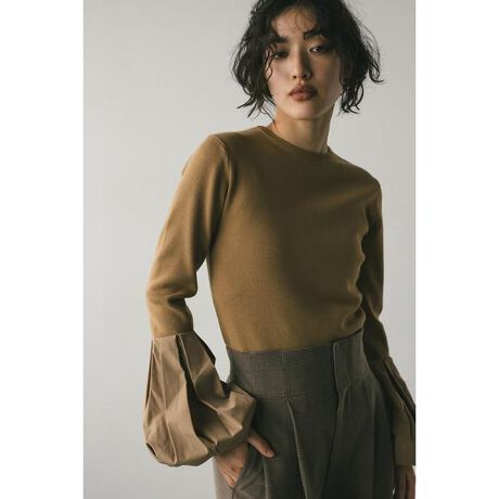 モデル身長166cm(FREEサイズ着用)ニットと布帛のドッキングデザインがポイントのニットトップ。ニット部分はボディラインが響きにくい厚みのある編地を使用。袖部分は張り感のある布帛生地を使用し、タッキングで作りあげたバルーンシルエットが上品で大人な印象に導きます。ストレッチあり、透け感なし。【お手入れ方法】手洗い可