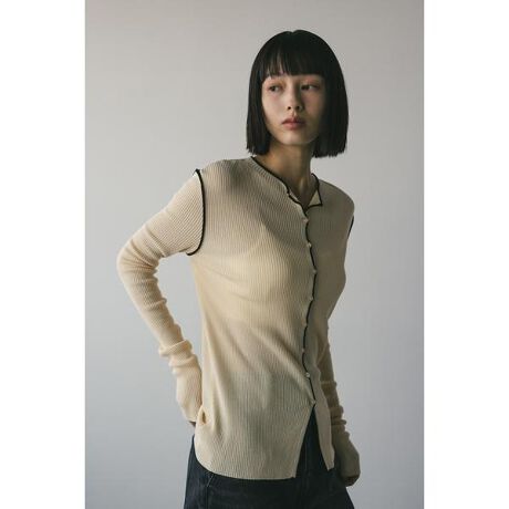 モデル身長166cm(FREEサイズ着用)ネックラインやアームにあしらったパイピングとコンパクトボタンが可愛い前後2WAYニット。ややウエストをシェイプさせたすっきりシルエットが女性らしい一枚。さらりとしたドライタッチ糸でリブ編みに編み立てているのでロングシーズン着用頂けます。透け感ややあり、ストレッチあり。【お手入れ方法】手洗い可