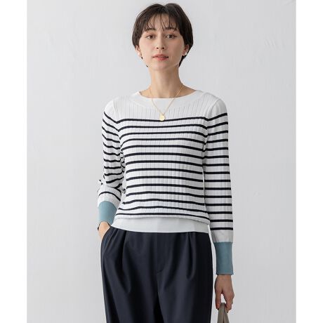 首まわりをきれいに見せてくれる大人のボートネックプルオーバーです。光沢の美しいリッチカジュアルな素材感が縦ラインのワイドリブに映え、すっきりと女性らしい雰囲気に。タイトすぎずもたつかない絶妙なサイズ感で一枚着でもインナーにも幅広いスタイリングに重宝するアイテムです。袖口にはボタン付きで、パネルボーダーには配色カラーもあしらいました。カラーは、無地のホワイト(#001)・ネイビー(#075)、ボーダーのオフ×ブラック(#105)・オフ×ネイビー(#175)の4色展開です。オフ×ブラックは袖口をベージュに、オフ×ネイビーはスモーキーブルーをアクセントに効かせています。