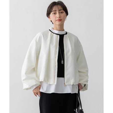 ジャガードならではの上品な表情のブルゾン。裾にドロストを入れた仕様になっており、スタイリングによってシルエットの変化をお楽しみいただけるアイテムです。フロントには金属ファスナーを使用し、開けて着用した時のアクセントにもなります。カラーは、明るく柔らかい雰囲気のアイボリー(#002)、こなれた印象でモード感漂うブラック(#005)の2色展開です。