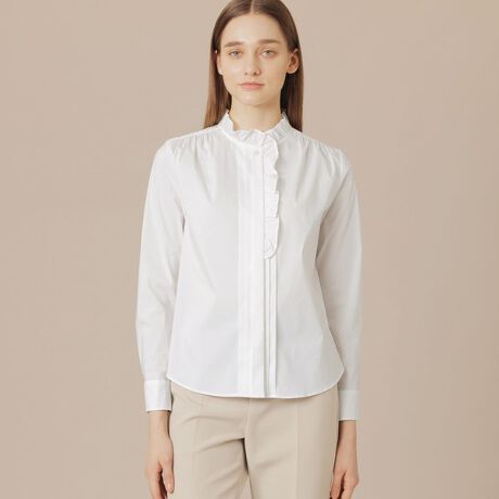ネックラインから前立てにつながるのフリルがポイントで、肩と袖口にギャザーを施しやさしいフォルムに仕上げたブラウスです。一枚ではもちろんジレやニットなどとのレイヤードにも活躍し、幅広いスタイリングをお楽しみいただける一着です。同素材のブラウス(品番:G5M04516)もご用意しております。
