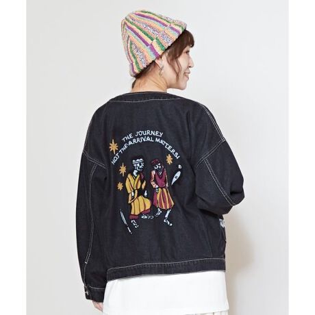 「ウズベキスタンにやってきたカラベラ」がモチーフの刺しゅうが施された、ノーカラーのデニムジャケット。パッチポケットと前開き部分のタックがポイント。英文は「旅とはどこかにたどり着くことではない」という意味。ウズベキスタンはシルクロードの交差点と呼ばれていることから、イスラミック建築やイカット、装飾ナイフ、スザニ刺繍などをモチーフにデザイン。