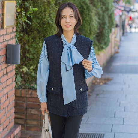 華やかなフリンジディティールがポイントのツイードジレ。