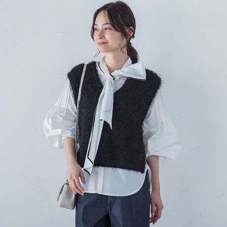 光沢感があり、さらっとした手触りのフェザーヤーンで作った華やかな印象のベスト。