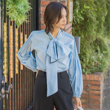 ジレのにインナーにも着映えするボリュームスリーブのボウタイブラウス。