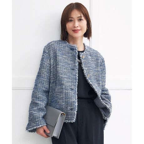 きれいめカラーのファンシーツイードジャケット■デザインカーディガンを羽織るようなリラックスしたボクシーシルエットのノーカラージャケットです。肩周りや袖を柔らかく作り、かしこまりすぎないジャケットに仕上げました。襟ぐり、裾、前開き、袖口にフリンジを挟み込みアクセントにしています。別布のグログラン生地を前見返しに使用し、より軽くすっきりとした仕様にしています。ラグジュアリーなコーディネートからカジュアルまでお使い頂けるアイテムです。■素材イタリアの高級ファブリックメーカーGIOLICA社のコレクションの中からピックアップしたツイードです。配色は自由区オリジナルで、ブルー系、ベージュ系の配色を別注しました。ベースには杢糸、ショウセン糸のリボンヤーンがアクセントとなり、ソフトで膨らみがありながらも軽い素材に仕上げています。かしこまった印象になりすぎない、リラックスした雰囲気のツイードで、様々なシーンで着て頂けます。
