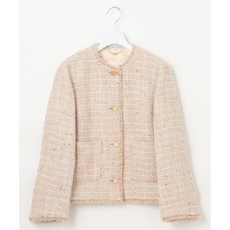 きれいめカラーのファンシーツイードジャケット■デザインカーディガンを羽織るようなリラックスしたボクシーシルエットのノーカラージャケットです。肩周りや袖を柔らかく作り、かしこまりすぎないジャケットに仕上げました。襟ぐり、裾、前開き、袖口にフリンジを挟み込みアクセントにしています。別布のグログラン生地を前見返しに使用し、より軽くすっきりとした仕様にしています。ラグジュアリーなコーディネートからカジュアルまでお使い頂けるアイテムです。■素材イタリアの高級ファブリックメーカーGIOLICA社のコレクションの中からピックアップしたツイードです。配色は自由区オリジナルで、ブルー系、ベージュ系の配色を別注しました。ベースには杢糸、ショウセン糸のリボンヤーンがアクセントとなり、ソフトで膨らみがありながらも軽い素材に仕上げています。かしこまった印象になりすぎない、リラックスした雰囲気のツイードで、様々なシーンで着て頂けます。