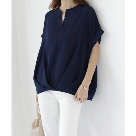 フェミニンな雰囲気のキーネックシフォンブラウス。