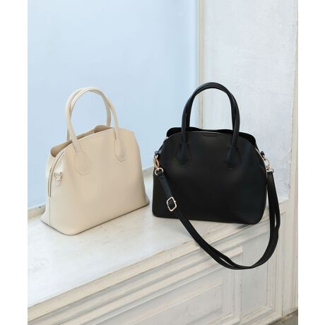 マットなフェイクレザーで仕立たツーハンドルバッグ。丸みのあるフォルムのコンパクトなサイズで普段のお出かけに最適なデザインです。あおりやインナーポケットなど、小さいながらも多収納な作りが嬉しいポイント。大きく開くファスナー間口で出し入れしやすく、シーンに応じて使い分けが可能なショルダーベルト付きです。※モデル着用画像は、光の当たり具合で色味が違って見える場合がございます。※お使いのモニター環境によって商品の色味が違って見える場合がございます。