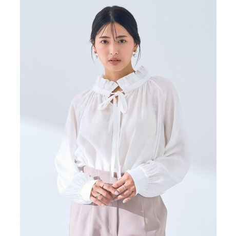 スタンドカラーに揺れるフリルが魅力的なブラウス。