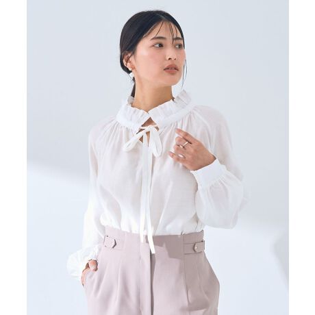 スタンドカラーに揺れるフリルが魅力的なブラウス。