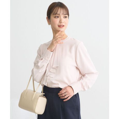 とろみドレープが美しいきれいめブラウス。バンドカラーのコンパクトなフォルムで着合わせしやすい一枚です。ネックラインのアクセントにタックを寄せたボウタイリボンをプラス。取り外し可能でスタイリングアレンジが出来るのも嬉しいポイントです。優しい立体感を見せるバックギャザー入りで後ろ姿も抜かりないレディなアイテムです。