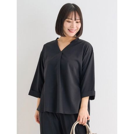 ・首元はスキッパーネックデザインで顔回りをスッキリ見せる。