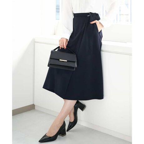 Aラインシルエットがきれいなスカート。大きめのタックデザインでラップ風を表現し、共地ベルト付き。Aラインのシルエットなので足さばきも良く、ラップ風なので、足元がはだける心配もありません。ウエスト後ろはゴム仕様で、快適な着心地。ベルトのDカンがキラリと光るアクセントに。