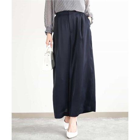 サテンの光沢感が上品なワイドパンツで、裾幅は広めですが落ち感があるので太さは気になりにくいです。裏地付きですが裾の方は少し透け感があり、濃い色でも軽やかな印象です。同素材のブラウスと合わせたきれいめコーディネートもおすすめですが、単品使いもしやすいデザインです。