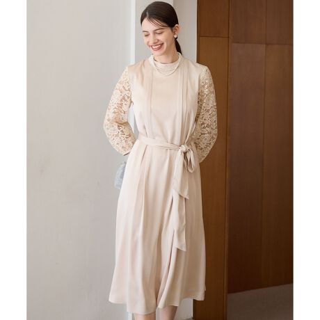 軽やかなレース袖デザインが印象的な素材コンビドレス。フロントにタックディテールを効かせたノーブルなデザインはそのままに。袖部分に新しい上品な箔レースを使用しアップデート。またボディと共生地リボンをウエストマークしてスタイルアップした着こなしや、後ろ襟元チェーンコードに通してボウタイのようにもお楽しみいただける仕様です。エレガントな雰囲気のシャンパン(#033)と、清楚な気品を感じるネイビー(#075)の2色展開です。