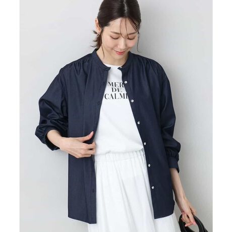 ボウタイは取り外し可能で、きれいめ可愛いスタイルでも、カジュアルでも着こなせるブラウスです。シンプルなバンドカラーのブラウスは前開きなので、羽織りとしても着用でき、着こなしの幅が広がります。一見デニムのようですが、デニムより柔らかくお手入れもしやすいのが魅力的です。