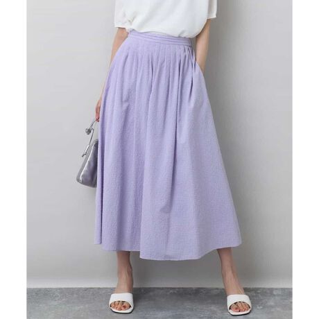 華やか見えな素材と裾に向かって広がるシルエットがポイントのスカート。ウエストには細かいタックを施し、すっきりと仕上げています。ウエスト後ろがゴム仕様になっていて、ラクな着心地の良さもポイント。