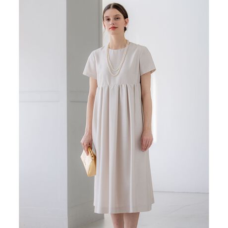 品のよい光沢感とハリ感が魅力のシャンタン素材で仕立てたドレス。端正な雰囲気のノーカラーデザインで、クルーネックの襟元とややコンパクトな袖をつけることで上半身はすっきりと。ハイウエストで切り替えたスカート部分にはエレガントなボリューム感をもたせたデザインです。同素材のジャケットとセットアップで組み合わせるノーブルなスタイルや、シーンに応じて華やかさのあるニットカーディガンとの組み合わせもおすすめです。カラーはやわらかな印象のシャンパン(#033)と、気品を感じさせるネイビー(#075)の2色展開です。