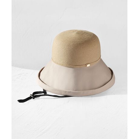 涼し気なブレードと綺麗見えの生地がコンビネーションになったつばが広めのサマーハット。