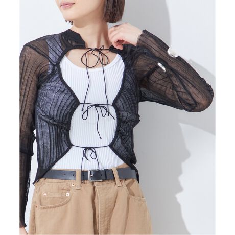 紐でギャザーを寄せるデザインのシアー感のある長袖カーディガン。