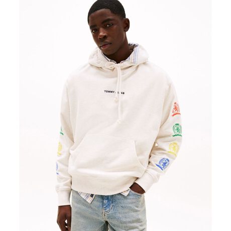 背面にカラフルなクレストプリントをのせたバーシティパーカー。両袖にも同グラフィックを刺しゅうで落とし込み、前中央にはTOMMY JEANSのマイクロロゴをあしらっています。全方位から視線を集めるインパクト抜群のアイテム。シルエットはインナーとのレイヤードも楽しめるリラックスフィットです。