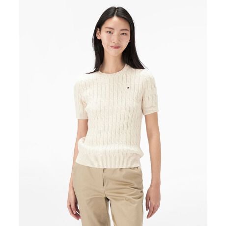 ミドルゲージのコットンニットを使用したショートスリーブクルーネックセーター。ケーブル柄から漂うトラディショナルな雰囲気が、普遍的な価値観を保ちます。左胸にはフラッグロゴのワンポイント刺しゅうをあしらいました。シルエットもベーシックなレギュラーフィットを採用しています。