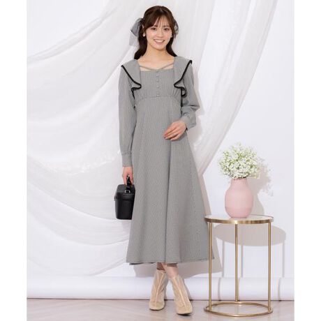 クラシカルなムードを演出してくれるフリルワンピース【Design】・スクエアネックでスッキリと仕上げた長袖のロングワンピース。・配色パイピングのフリルがメリハリある仕上がりの一着です♪・広く開いたスクエアネックは首を細く長く見せてくれる効果◎・袖口には程よくボリュームを持たせ、柔らかいシルエットで女性らしさを演出してくれます。・裾に向かって広がるフレアデザインで、歩くたびにふんわりと広がります。・後ろは伸縮性のあるシャーリング仕様になっており、リボンでお好みのサイズにご調整いただけます。・背中ファスナー仕様。【Fabic】・ドレープ感を演出してくれる柔らかな生地を使用。・程よいハリ感のある裏地付き。・ベージュ、ピンク、ブラックチェックの3色展開となります。【Care】ドライクリーニング