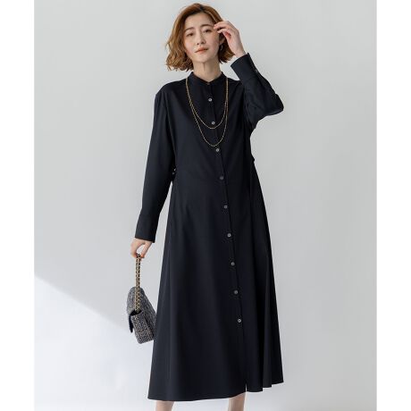 きちんと感を演出する長め丈のAラインのワンピース。ウエスト両サイドにバックルをあしらいアクセントになっています。上身頃はジャケットなどの羽織りを着てもかさばらないすっきりとしたシンプルな仕立て。裾に向かってフレアの分量を出すことで女性らしいシルエットになるようこだわりました。ちょっとしたお出かけや、お仕事、学校行事などにも活躍するデザイン。ウエストの両脇のバックルでサイズ感を調整していただくことができます。同素材のジャケットとセットアップでの着用もおすすめです。カラーは着回しやすいネイビー(#075)と、洒落感のあるライトグレー(#003)の2色展開です。