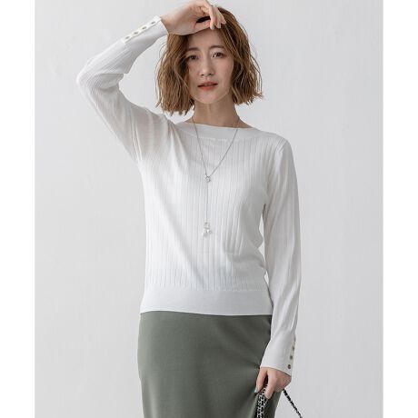 首まわりをきれいに見せてくれる大人のボートネックプルオーバーです。光沢の美しいリッチカジュアルな素材感が縦ラインのワイドリブに映え、すっきりと女性らしい雰囲気に。タイトすぎずもたつかない絶妙なサイズ感で一枚着でもインナーにも幅広いスタイリングに重宝するアイテムです。袖口にはボタン付きで、パネルボーダーには配色カラーもあしらいました。カラーは、無地のホワイト(#001)・ネイビー(#075)、ボーダーのオフ×ブラック(#105)・オフ×ネイビー(#175)の4色展開です。オフ×ブラックは袖口をベージュに、オフ×ネイビーはスモーキーブルーをアクセントに効かせています。