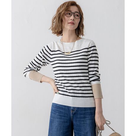 首まわりをきれいに見せてくれる大人のボートネックプルオーバーです。光沢の美しいリッチカジュアルな素材感が縦ラインのワイドリブに映え、すっきりと女性らしい雰囲気に。タイトすぎずもたつかない絶妙なサイズ感で一枚着でもインナーにも幅広いスタイリングに重宝するアイテムです。袖口にはボタン付きで、パネルボーダーには配色カラーもあしらいました。カラーは、無地のホワイト(#001)・ネイビー(#075)、ボーダーのオフ×ブラック(#105)・オフ×ネイビー(#175)の4色展開です。オフ×ブラックは袖口をベージュに、オフ×ネイビーはスモーキーブルーをアクセントに効かせています。